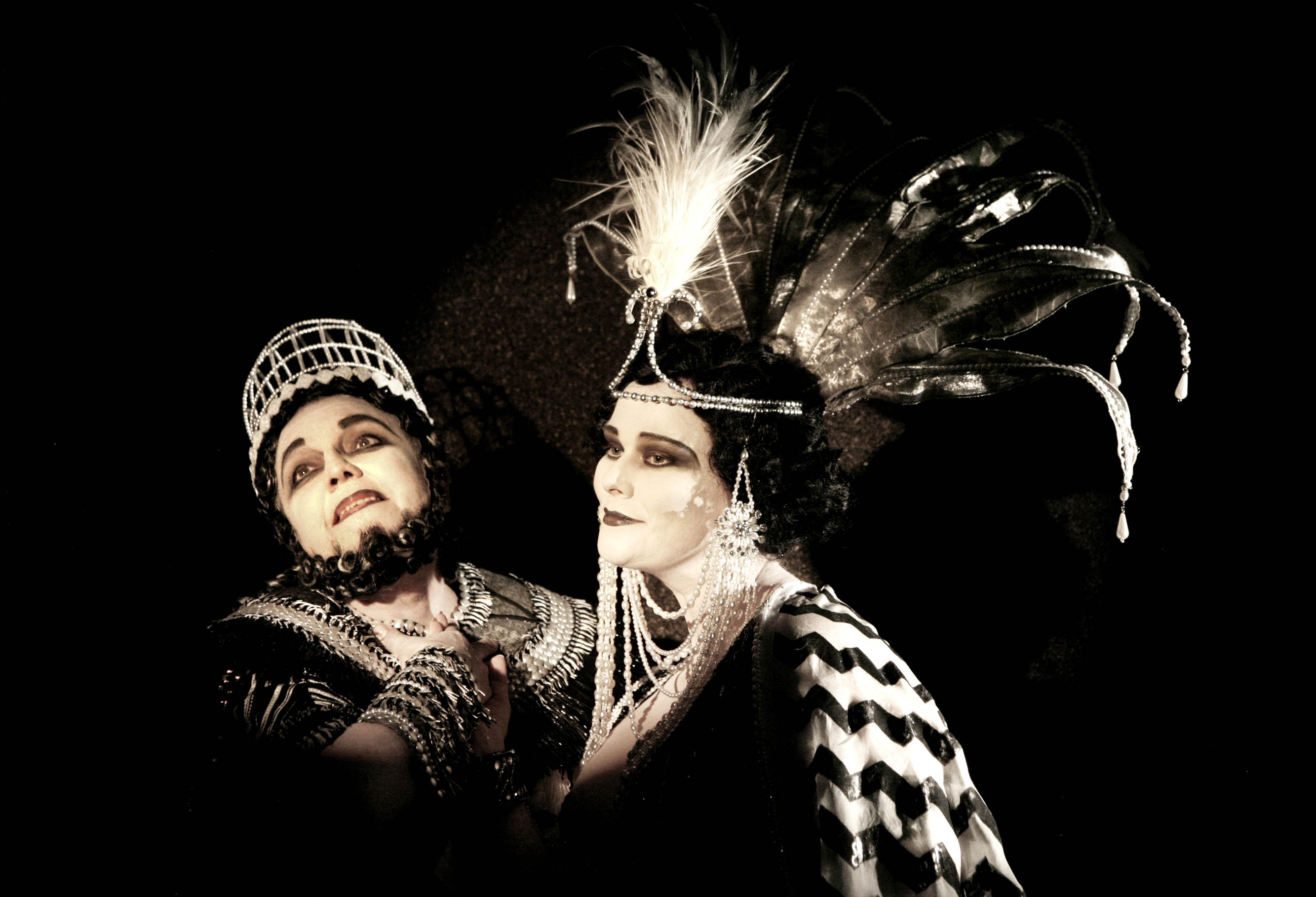 in bianco e nero, scene color gravure, spezzoni o echi di film (l’episodio babilonese di Intolerance di Griffith nel primo atto, la scena del sacrificio umano di Cabiria di